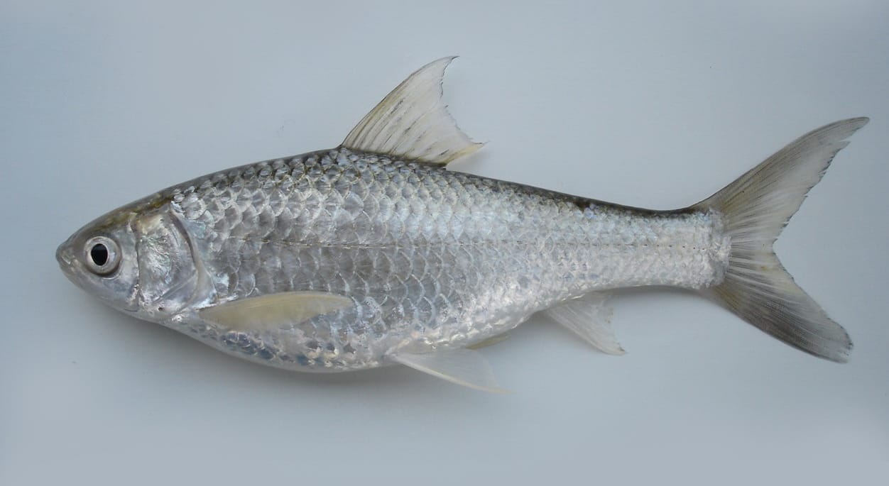 Hora White Carp is a slender, silver-white carp from rivers in India and Bangladesh, feeding on detritus and algae, and contributing to ecosystem balance.
