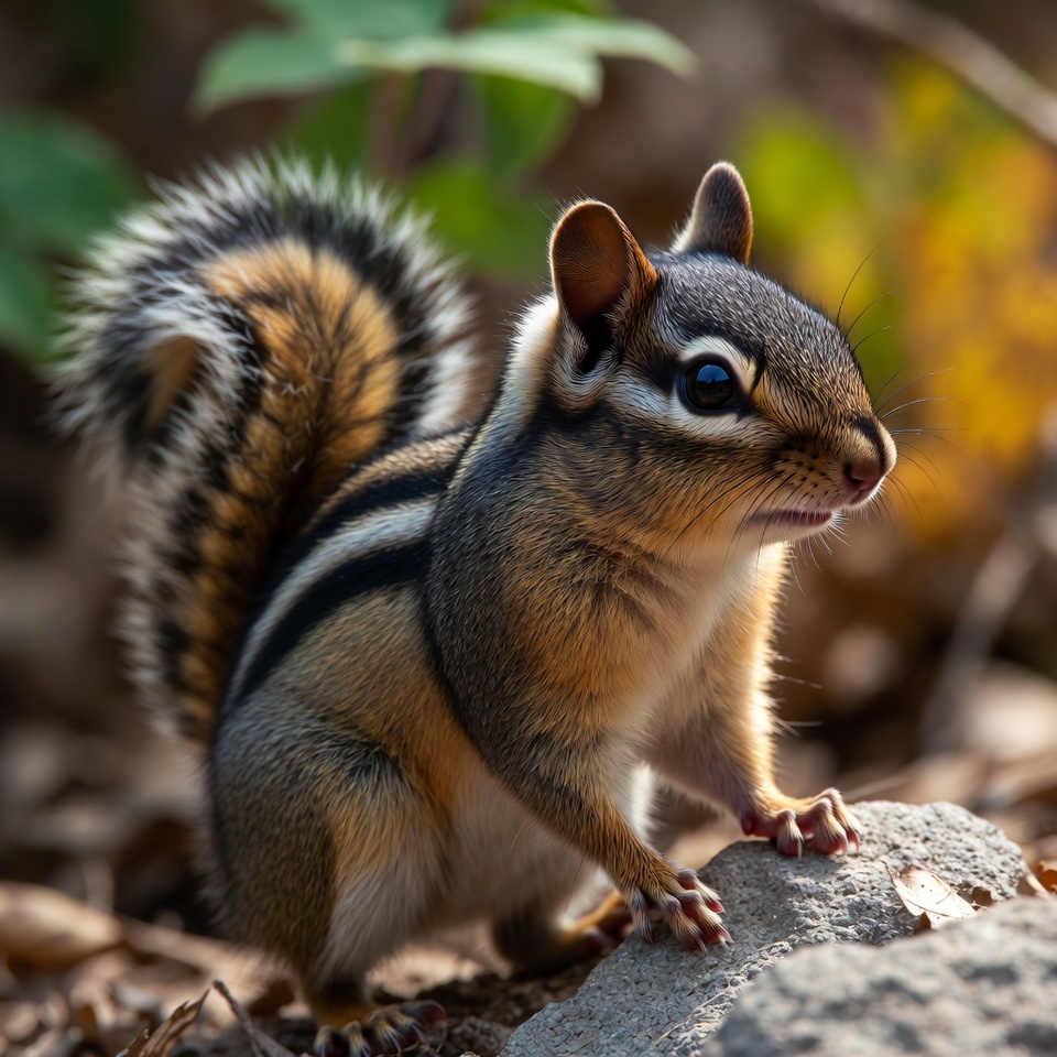 These chipmunks are solitary and territorial. Communication occurs through vocalizations, tail flicks, and scent marking. Agile and alert, they are skilled at climbing and evading predators.