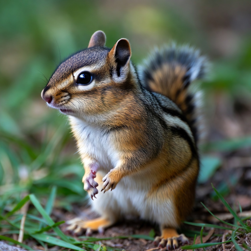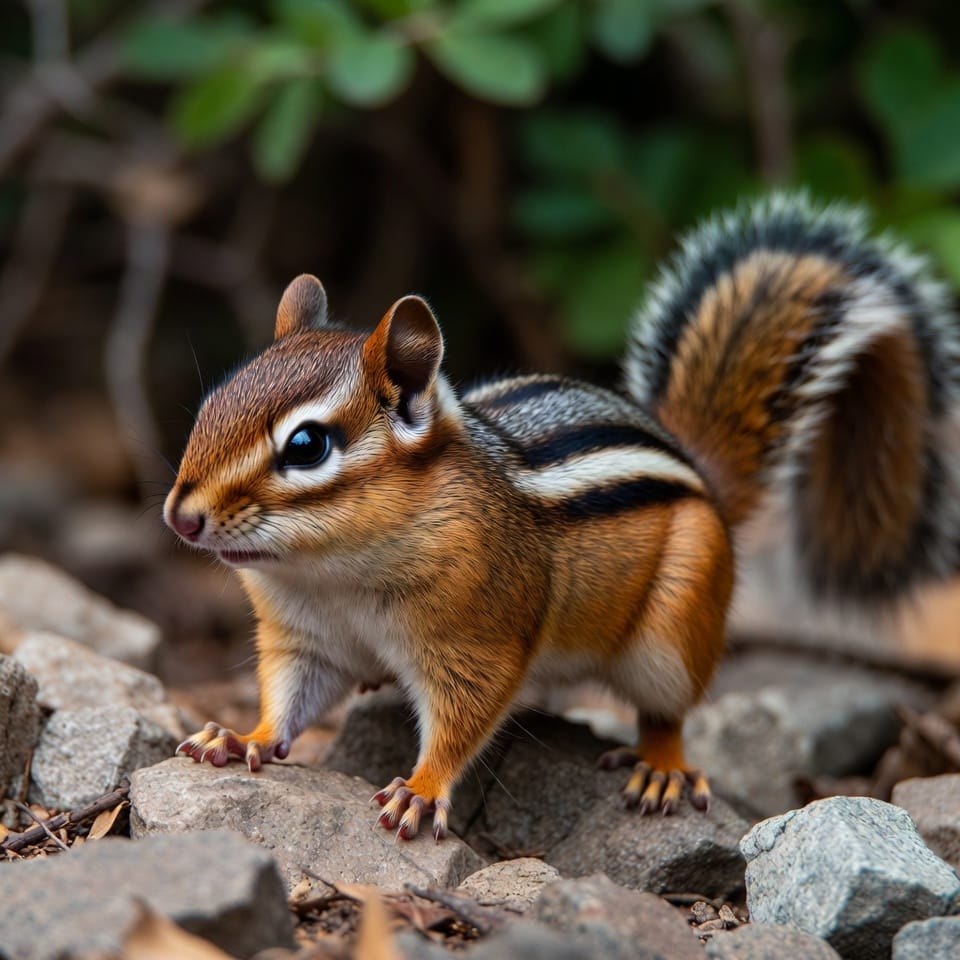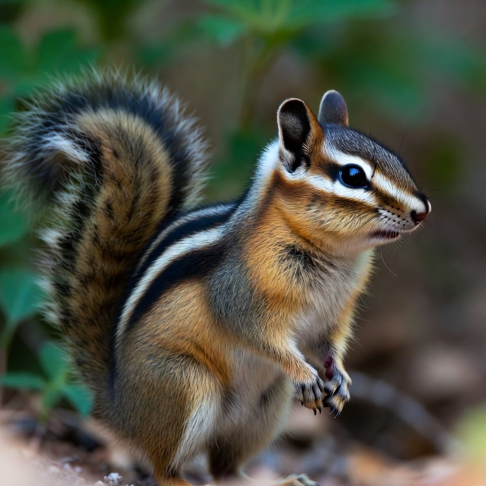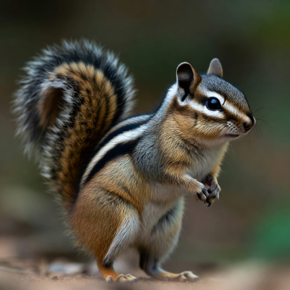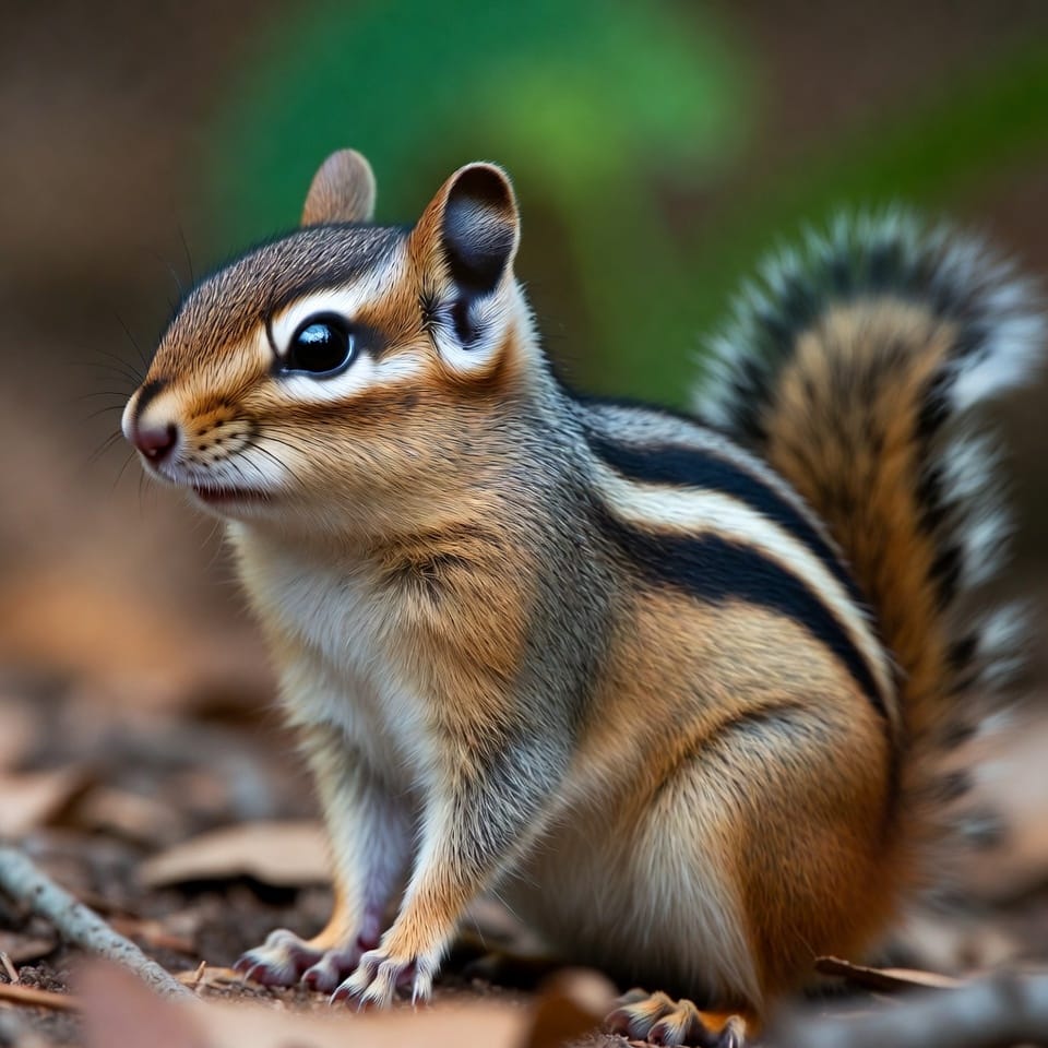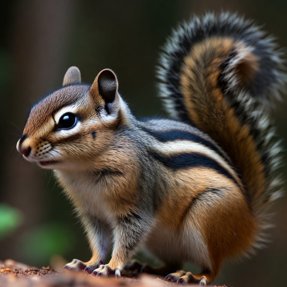 The Siberian Chipmunk is native to Asia and features a reddish-brown coat with five dark stripes on the back and lighter stripes in between. It is slightly larger than the Least Chipmunk, measuring 8–10 inches including its tail. Its bushy tail, bright eyes, and swift movements are characteristic of the species.