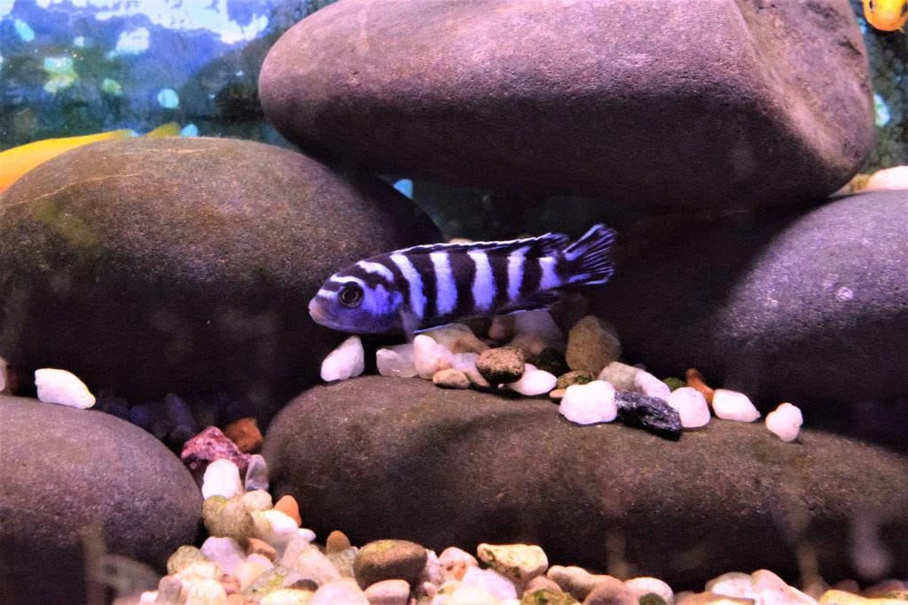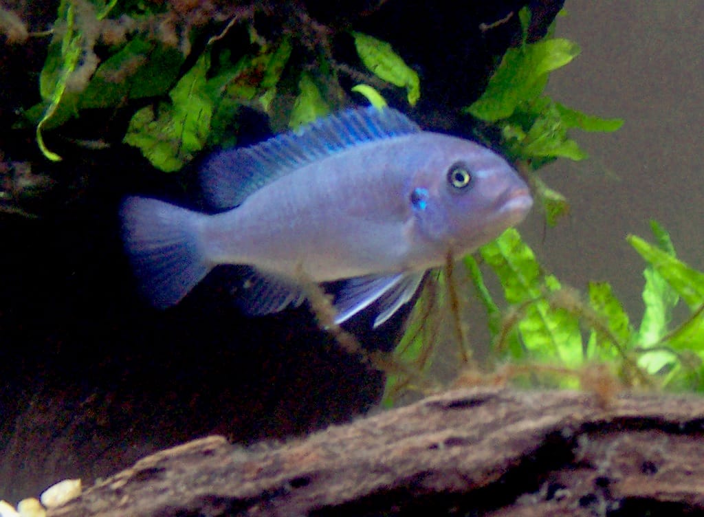 Blue Zebra, native to Lake Malawi, is a medium-sized Mbuna cichlid, growing up to 4 inches. Males are bright electric blue, while females are typically lighter blue or grayish. Known for their territoriality, these cichlids are lively and display fascinating behaviors, often engaging in rock hopping and chasing rivals.
