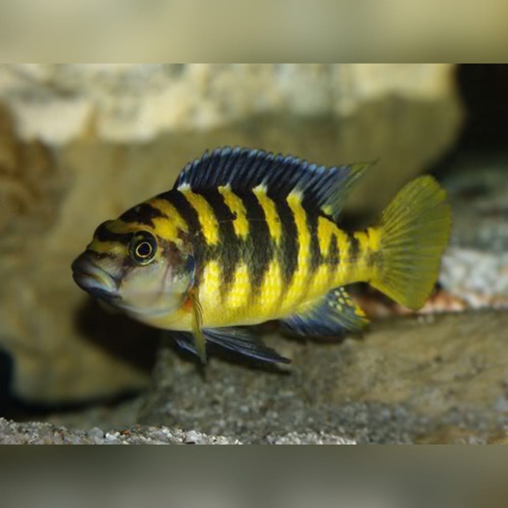 Fuelleborn’s Cichlid is another stunning Mbuna species from Lake Malawi, characterized by its deep blue body with prominent horizontal stripes. They reach approximately 4–5 inches in length and are known for their dynamic and sometimes aggressive behavior, typical of many Mbuna cichlids.