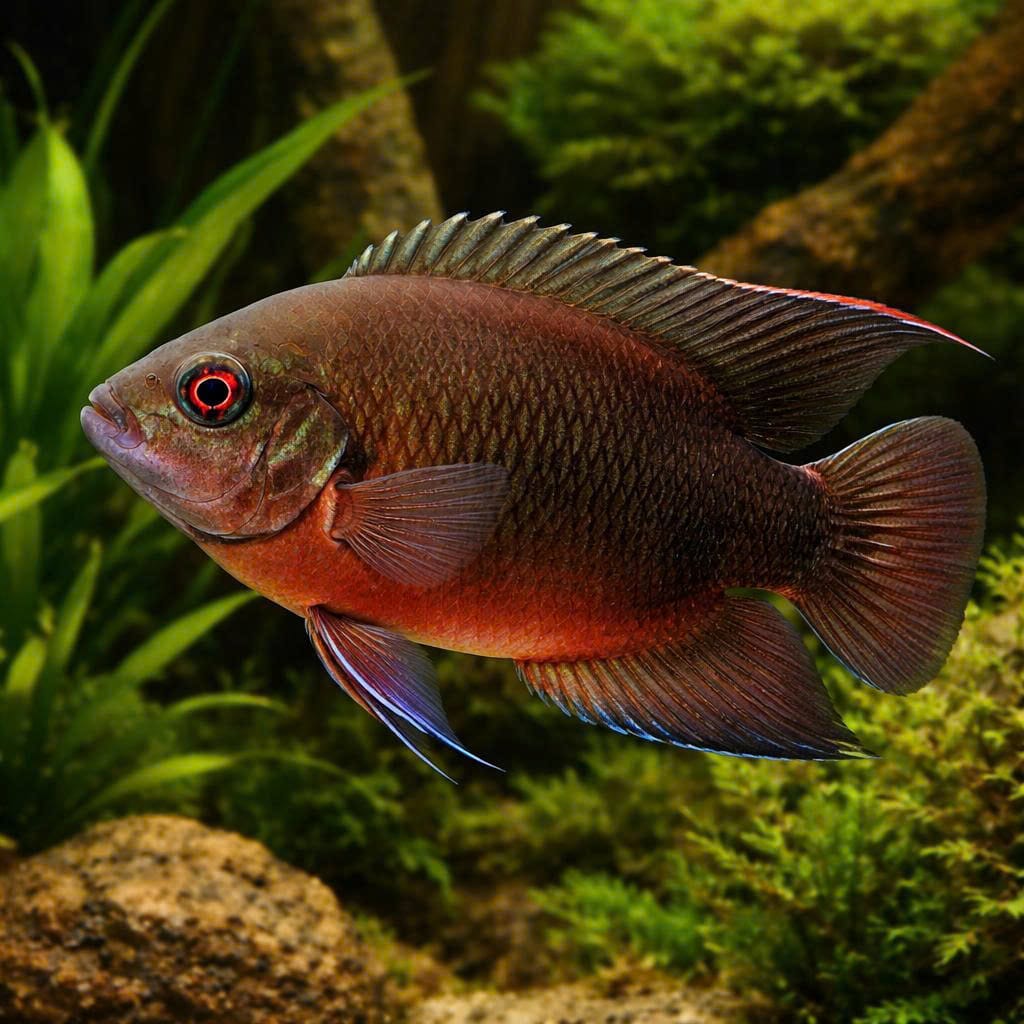 The Chocolate Cichlid is a medium-sized South American cichlid known for its warm brown coloration and subtle iridescence. Native to slow-moving rivers and flooded forest areas in the Amazon, these cichlids reach around 6–8 inches in captivity. Despite their muted colors compared to other cichlids, they are admired for their calm demeanor and graceful swimming patterns.
