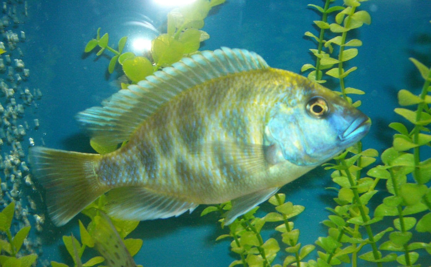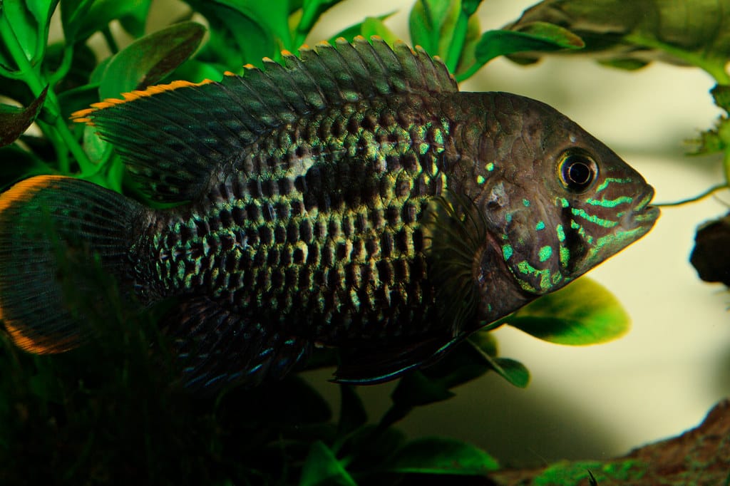 Named after the famous boxer for their fighting spirit, Jack Dempsey cichlids are native to freshwater rivers in Central America. They are medium-to-large cichlids, reaching up to 10–15 inches in length. Their body is covered in iridescent blue and green scales with darker vertical bands, creating a striking pattern.