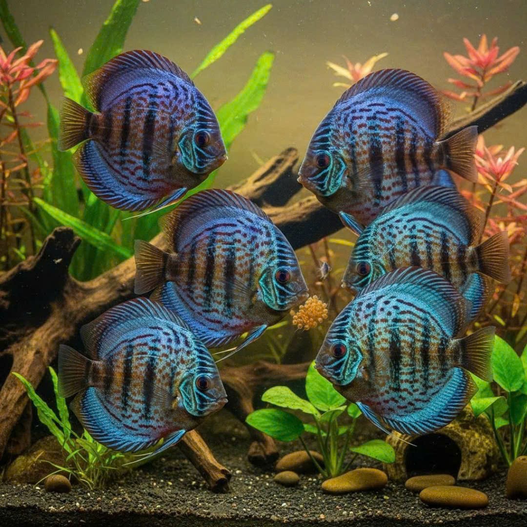 Heckel Discus is a South American cichlid native to the Rio Negro and its tributaries. They are admired for their deep body shape, elegant swimming style, and intricate coloration patterns with red, blue, and green stripes. Adults grow to about 6–8 inches and are sensitive to water quality, requiring stable and pristine conditions.