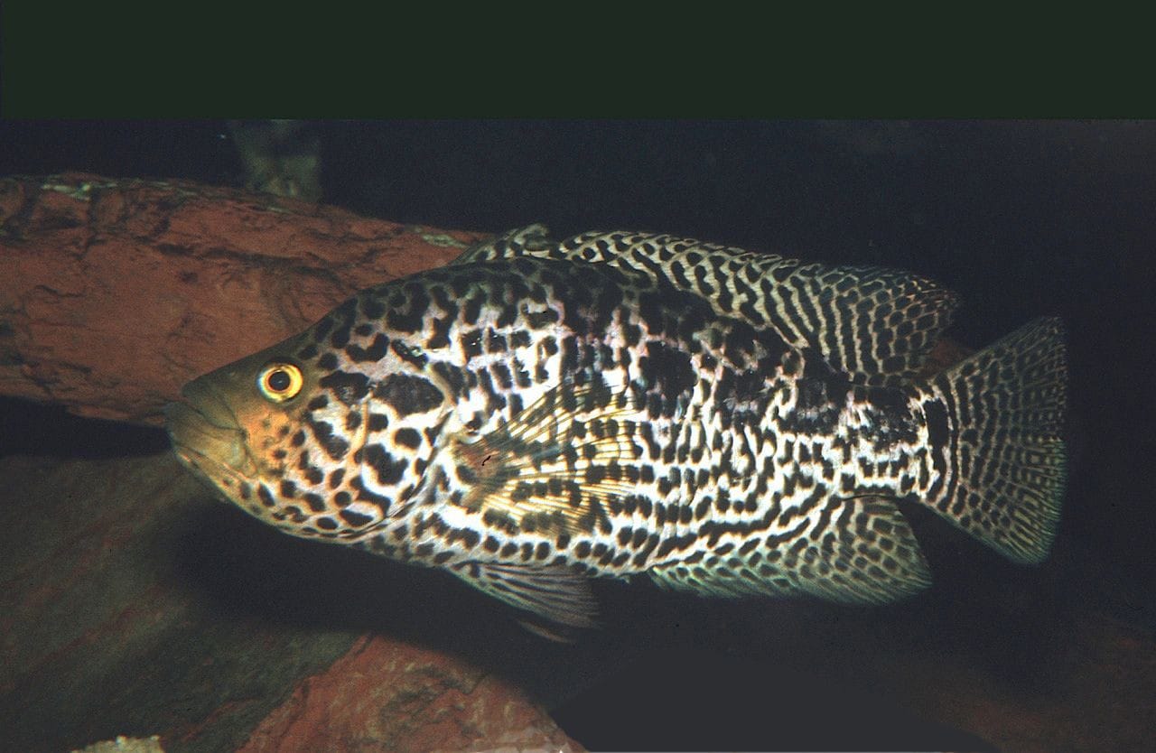 The Jaguar Cichlid is a large predatory fish from Central America, reaching 12–18 inches in captivity. It has a golden-yellow body adorned with black spots, reminiscent of a jaguar, giving it its name. Known for its aggressive and territorial behavior, this cichlid commands attention in any aquarium.