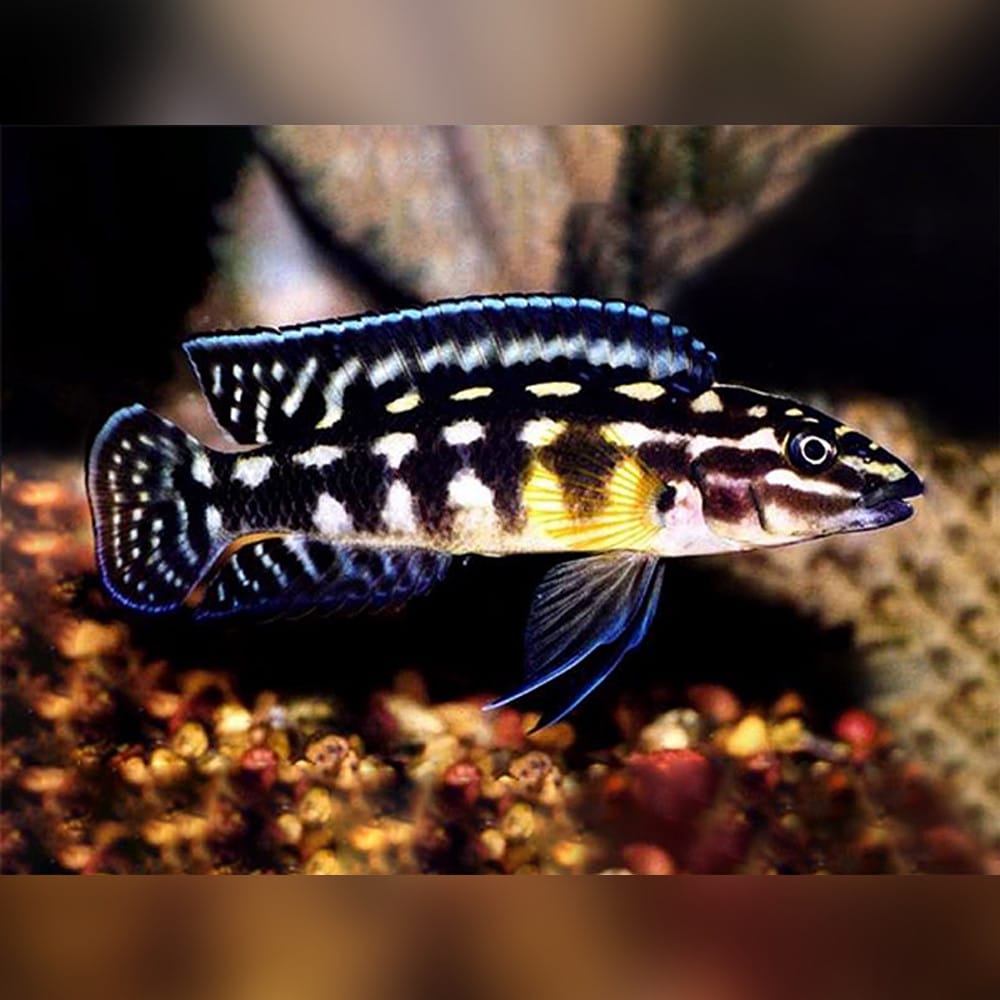 Masked Julie is a small, elegant cichlid from Lake Tanganyika, Africa, growing up to 4 inches. They are easily identified by their slender bodies and distinctive horizontal black stripes on a yellow or golden base, resembling a “masked” pattern. Masked Julies are social fish that thrive in pairs or small groups.