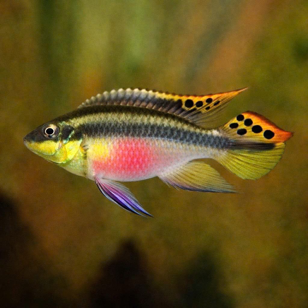 Kribensis, also called Kribs, are small African cichlids from Nigeria and Cameroon. They reach about 3–4 inches and exhibit beautiful hues of yellow, red, and purple, especially on the belly of females. Kribs are known for their fascinating reproductive behavior, including complex courtship displays and attentive parental care.