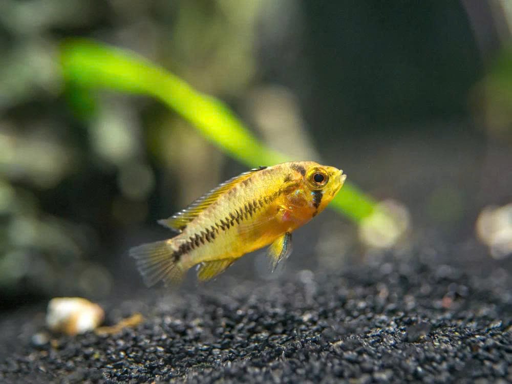 Bolivian Rams are slightly larger than German Blue Rams, reaching up to 3 inches, and are known for their soft coloration and adaptability. Native to the slow-moving rivers and streams of Bolivia, they display subtle shades of gold, blue, and red, with distinctive black markings along the lateral line.