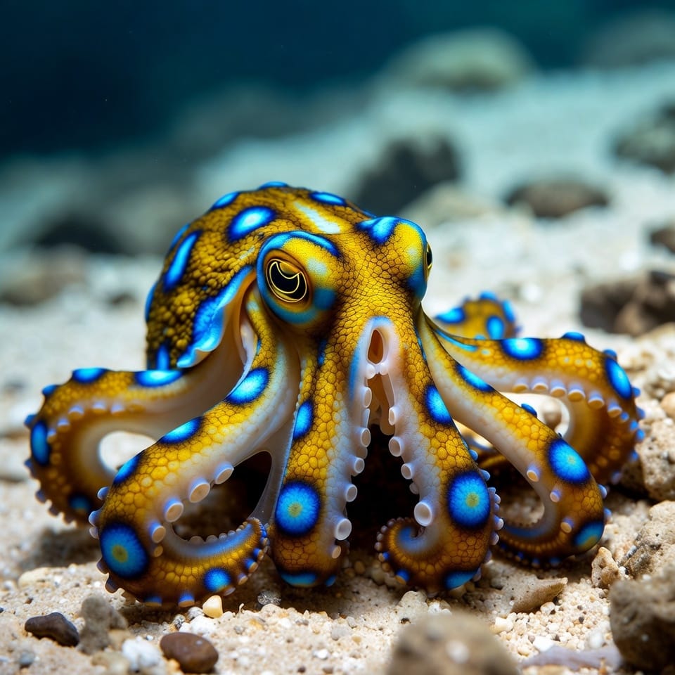 The blue-ringed octopus is a small but venomous cephalopod with bright blue rings, found in Pacific and Indian Ocean reefs.