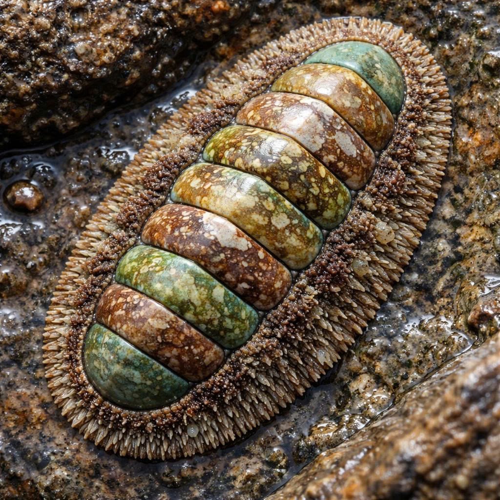 Chitons are mollusks with flat bodies and eight dorsal plates, scraping algae off rocks in intertidal zones.