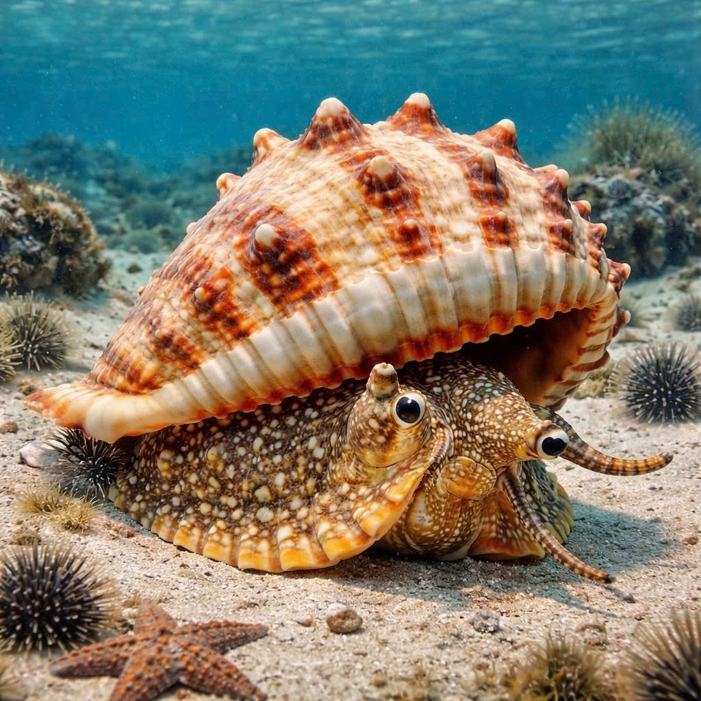 Helmet shells are large marine gastropods with thick, robust shells, often decorated with ridges or patterns. They inhabit shallow tropical and subtropical waters, living on sandy or muddy bottoms. Helmet shells are predatory, feeding mainly on echinoderms like sea urchins and starfish.
