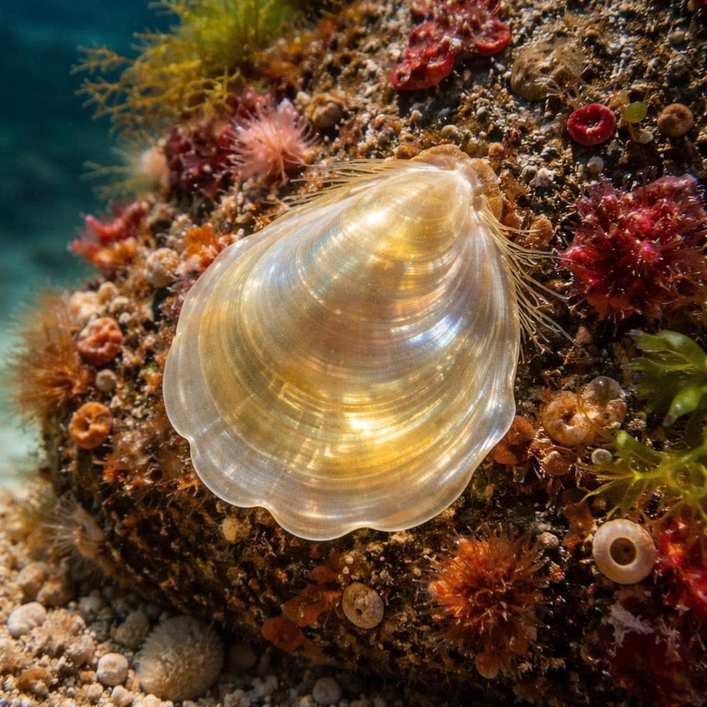 Jingle shells are small, thin bivalve mollusks found in marine environments along coasts worldwide. Their shells are often translucent and produce a tinkling sound when moved, which is how they get their name. Typically measuring 2–4 cm, they attach to rocks, piers, and other hard surfaces using byssal threads.