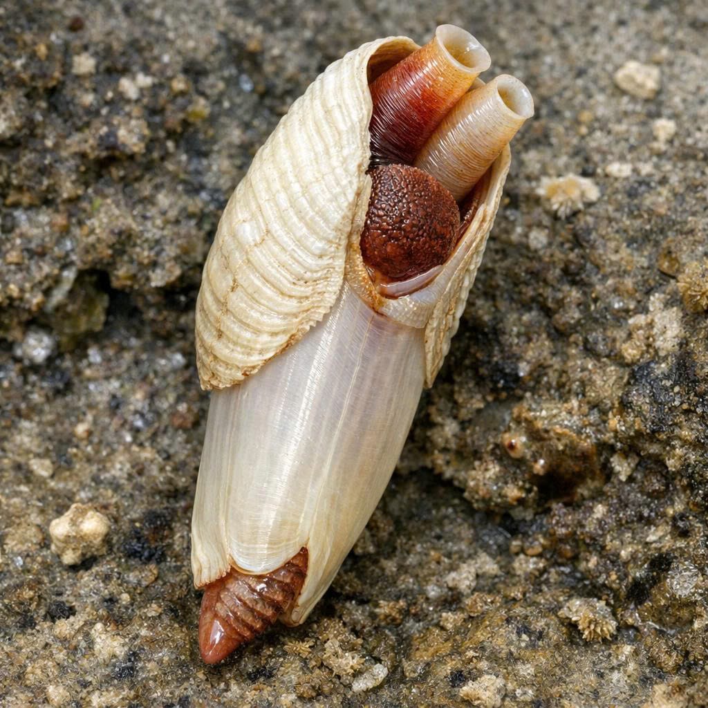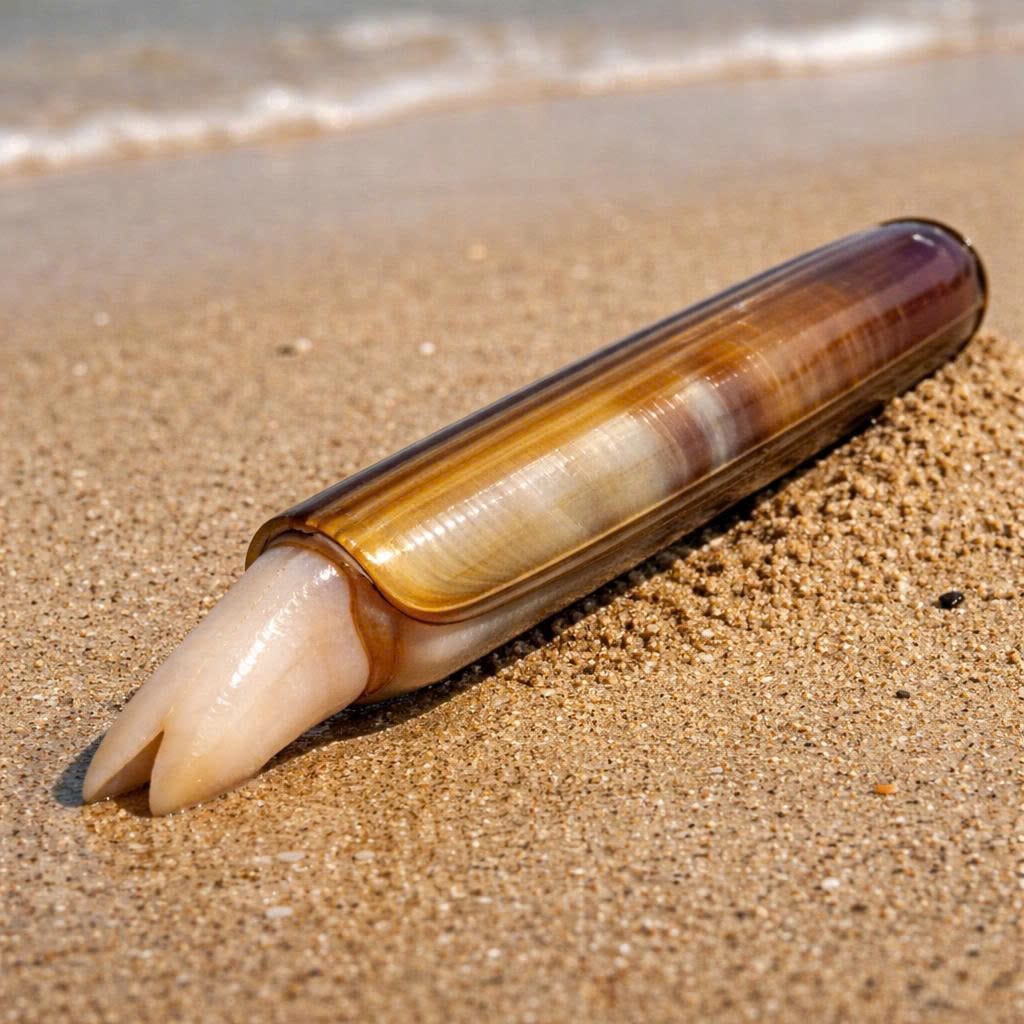 Razor clams are elongated bivalve mollusks that live in sandy beaches along coasts worldwide. Their name comes from their thin, sharp shells that resemble old-fashioned straight razors. These clams typically burrow deeply into sand, leaving only a small siphon exposed for feeding and breathing. Razor clams are highly prized as seafood due to their sweet, tender meat.