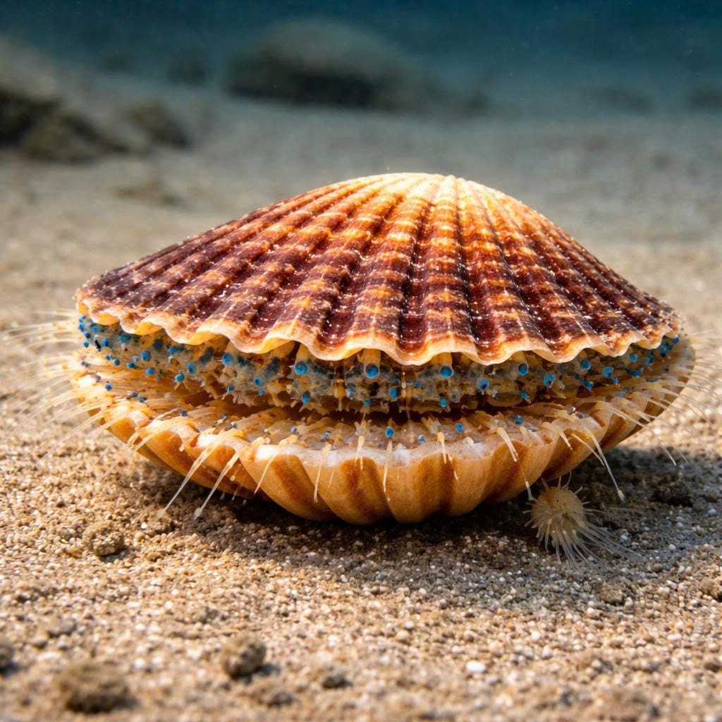 Scallops are bivalve mollusks renowned for their fan-shaped shells and swimming ability. They inhabit shallow coastal waters and the continental shelf, burrowing into sand or mud or attaching to substrates with byssal threads. Scallops are filter feeders, using gills to strain plankton and organic matter from water.