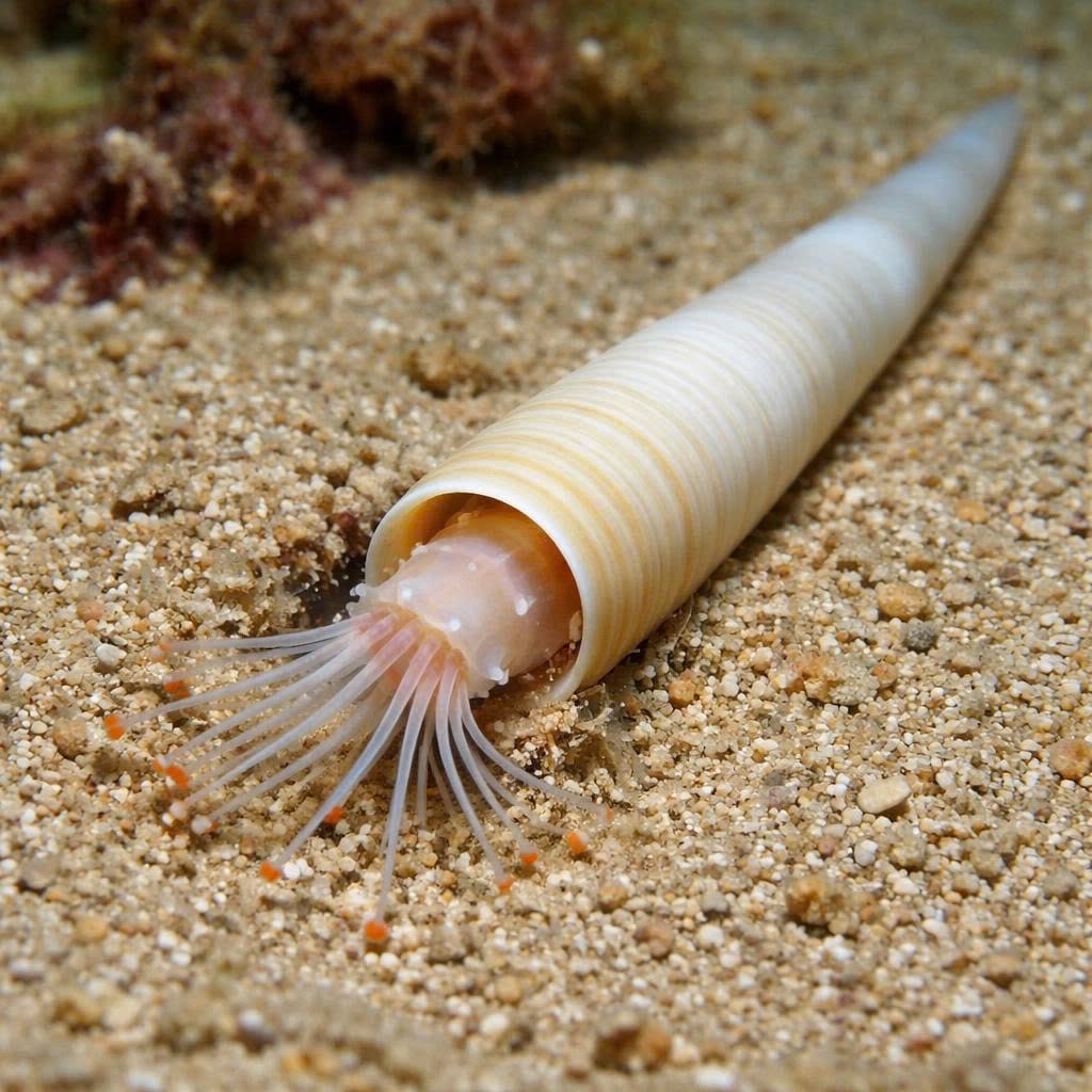 Adult cone shells range from 5 to 15 cm. Their venom is highly potent and can be dangerous to humans, making careful handling essential. Reproduction involves external fertilization, with planktonic larvae dispersing before settling. Cone shells play a vital ecological role by controlling prey populations and maintaining the balance in reef ecosystems.
