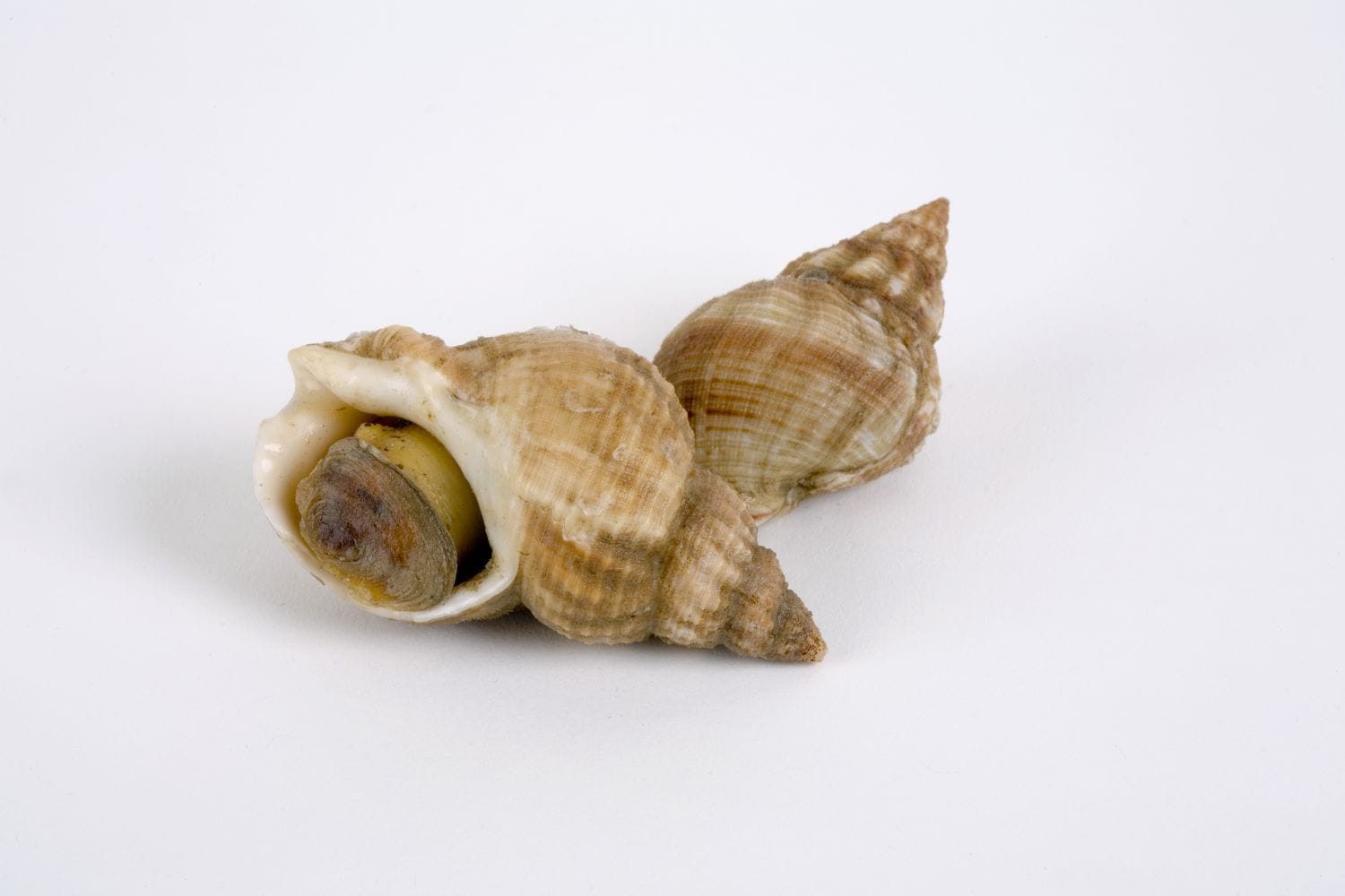 Whelks are predatory sea snails commonly found in temperate and cold waters, inhabiting sandy or muddy seabeds. Their thick, spiral shells provide protection from predators, while their large foot and siphon enable them to hunt and move efficiently. Whelks feed primarily on bivalves and other invertebrates, drilling into shells or swallowing prey whole.