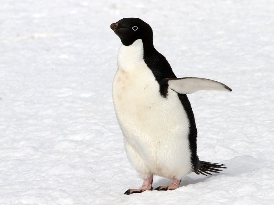 The Adélie Penguin is a medium-sized species, averaging about 70 centimeters (2.3 feet) in height and weighing between 3.6–6 kilograms (8–13 pounds). Their characteristic black head and back, contrasting with a white belly, create the classic “tuxedo” look commonly associated with penguins. A distinguishing feature is the white ring around the eyes, giving them an expressive, almost cartoonish appearance.
