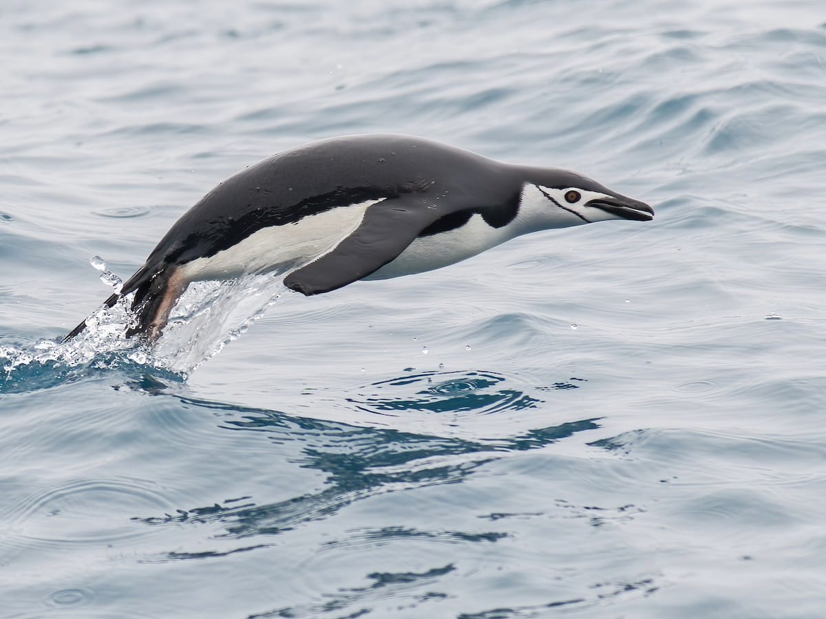 These penguins primarily feed on krill but also consume fish and small squid. Their strong flippers and hydrodynamic shape allow for swift, agile movements in water, often reaching speeds up to 8 kilometers per hour (5 mph). They are known for their stamina, diving repeatedly to catch prey during foraging trips. Predators include leopard seals and skuas, but Chinstrap Penguins rely on agility, colony density, and group vigilance for protection.