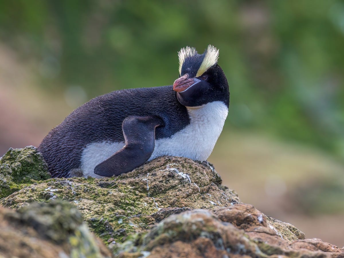 Erect-crested Penguins breed in colonies on rugged, rocky terrain and tussock-covered slopes. Both parents share responsibilities for incubating the two-egg clutch and feeding the chicks once hatched. Unlike some other penguin species, these birds often have asynchronous hatching, meaning one chick may be larger than the other, which affects feeding hierarchy. Their diet mainly consists of small fish and squid, which they capture through agile diving and coordinated swimming. These penguins are highly social within their colonies, with loud vocalizations and displays reinforcing pair bonds and territory boundaries.