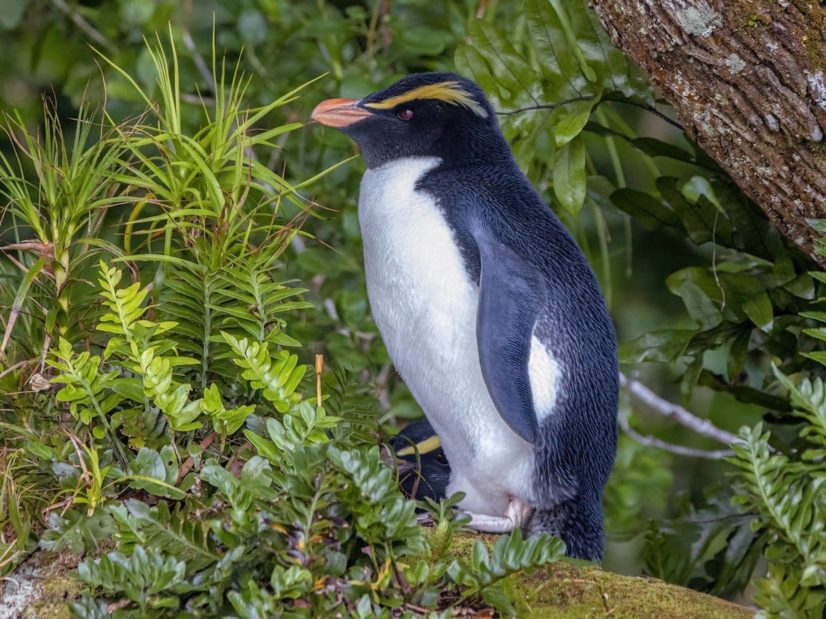 Fiordland Penguins breed in dense temperate forests, nesting in burrows or under fallen trees, often on steep, inaccessible slopes. Their diet primarily consists of small fish and squid, which they capture through agile and sustained underwater swimming. This species exhibits strong site fidelity, often returning to the same nesting areas each season. Chicks are cared for by both parents, who alternate foraging trips to the sea and protecting the young in the nest.