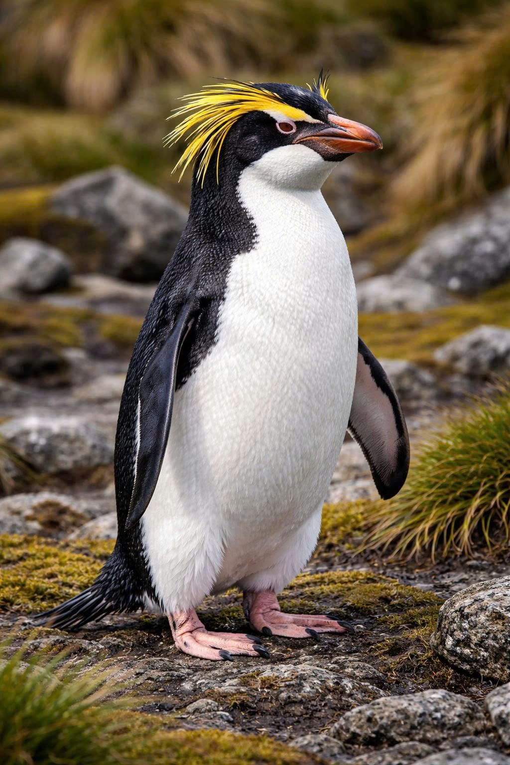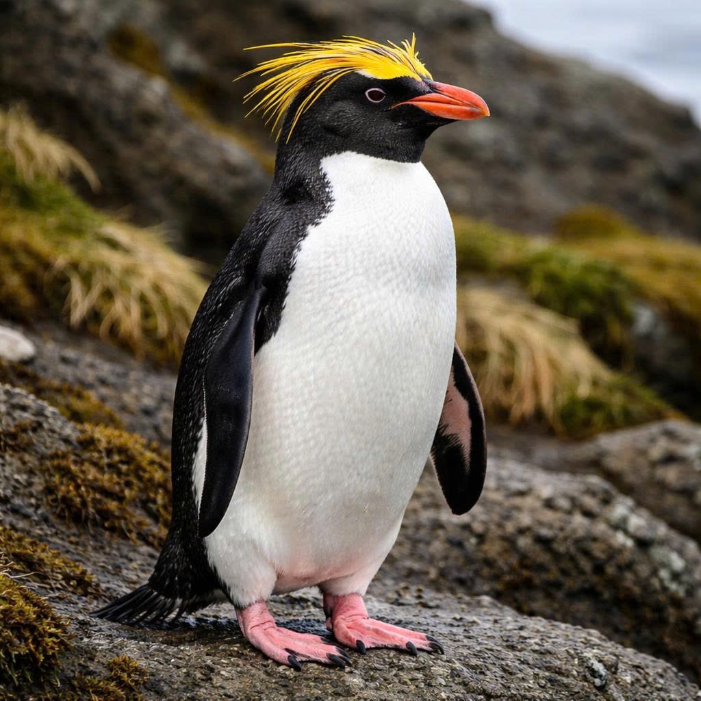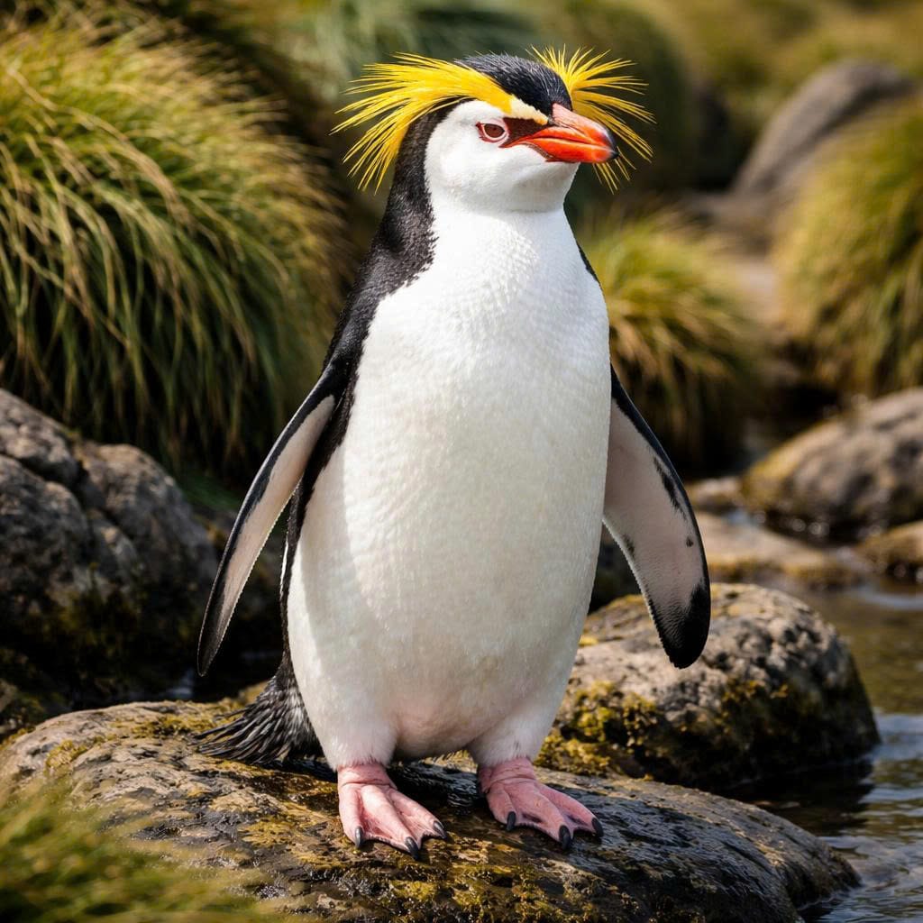 The Royal Penguin is easily recognized by its white face, yellow crests, and black crown. Found exclusively on Macquarie Island in the southwestern Pacific, adults reach 60–70 centimeters (24–28 inches) in height and weigh 3–5 kilograms (6–11 pounds). Unlike other crested penguins, the Royal Penguin’s distinctive facial markings make it particularly striking, and it is often considered a sub-species or close relative of the Macaroni Penguin. Their habitat consists of coastal tussock grasslands and rocky shores, providing shelter and nesting sites.