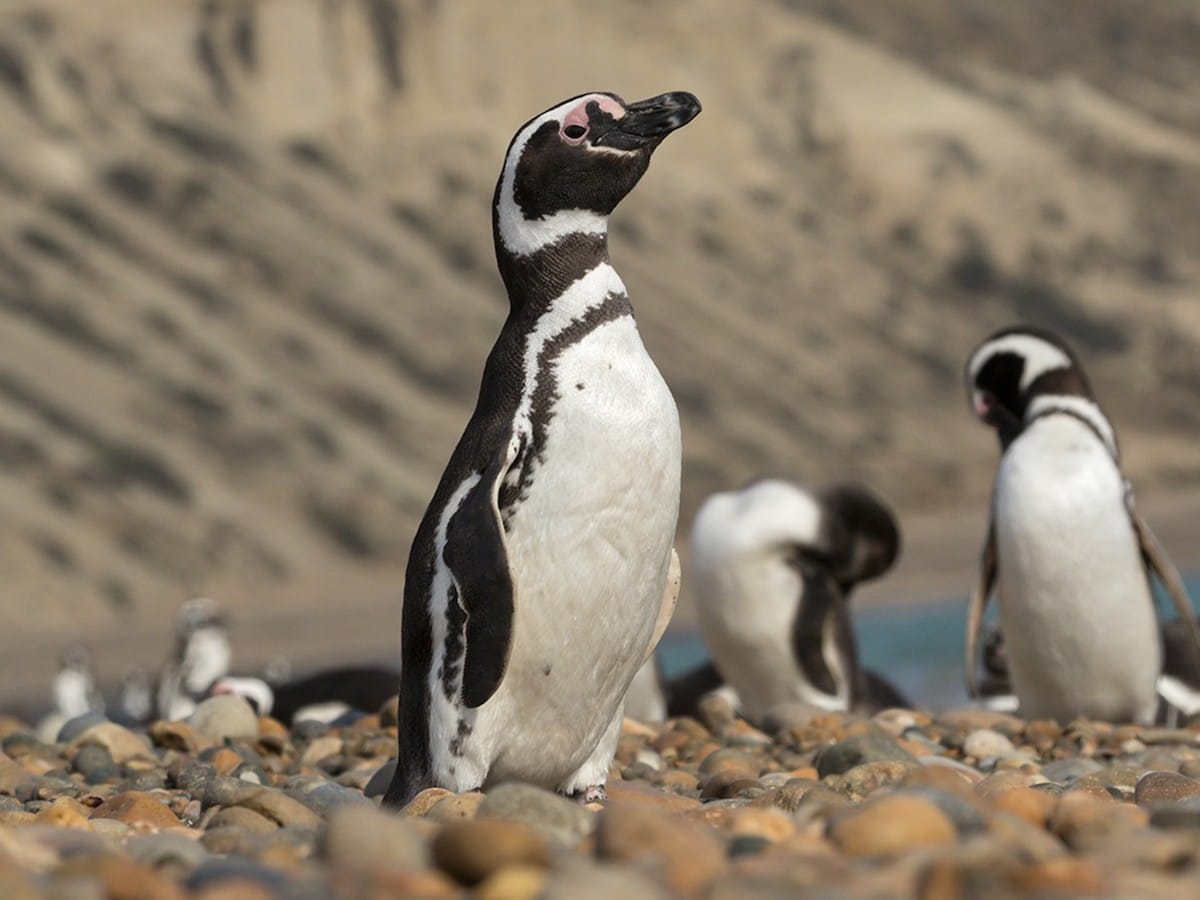 The Magellanic Penguin is a medium-sized penguin found along the coasts of Argentina, Chile, and the Falkland Islands. Adults measure 61–76 centimeters (24–30 inches) in height and weigh 2.7–6.5 kilograms (6–14 pounds). Recognizable by two black bands across their white chest, these penguins are robust, adapted to temperate climates, and capable swimmers and divers. Their diet includes small fish, squid, and krill.