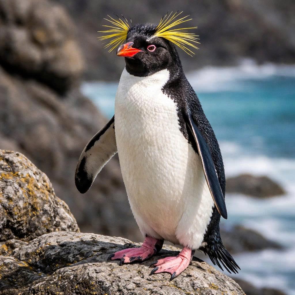 The Eastern Rockhopper Penguin is a variant of the crested penguins found on islands in the southwestern Pacific Ocean, including the Auckland and Campbell Islands. Adults are 55–65 centimeters (22–26 inches) tall and weigh around 2.5–3.5 kilograms (5–8 pounds). They share the characteristic yellow crests and red eyes of the Rockhopper group but are distinguished by subtle differences in crest length, plumage patterns, and vocalizations. These penguins are adept climbers and divers, thriving in rugged coastal landscapes.