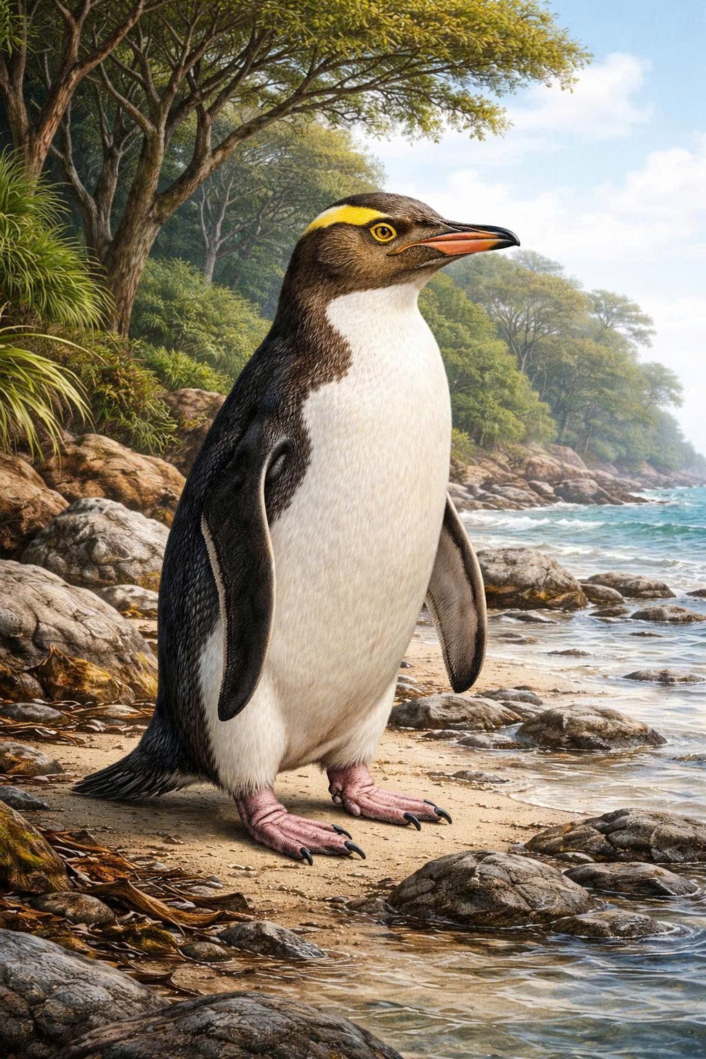 The Waitaha Penguin is an extinct species that once inhabited the coastal regions of New Zealand’s South Island. Adults were similar in size to the Yellow-eyed Penguin, standing about 65 centimeters (26 inches) tall and weighing around 5 kilograms (11 pounds). Genetic studies revealed that the Waitaha Penguin was replaced by the Yellow-eyed Penguin within the last 500–600 years, illustrating how environmental changes and human activity can dramatically affect penguin populations and biodiversity within the Types of Penguins.