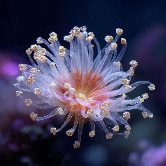 Tube Anemones differ from typical reef anemones by living buried in sand or mud, creating long, protective tubes. Cerianthus membranaceus can reach 30 cm in tentacle length and displays striking patterns and colors, ranging from white to purple or orange. They inhabit shallow coastal areas of the Mediterranean and Indo-Pacific.