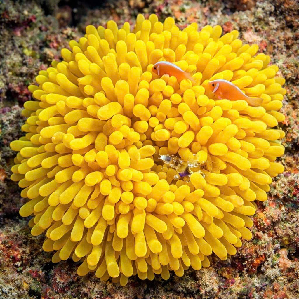 These anemones host symbiotic organisms, including shrimps and small fish, benefiting from nutrient exchange and protection. Golden Anemones retract tentacles when threatened and expand when feeding, demonstrating behavioral adaptability.