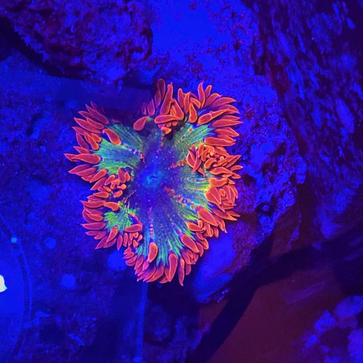 Rock Flower Anemones are popular in marine aquaria due to their vibrant colors and hardy nature. They can range from purple to pink, green, and even fluorescent shades. Native to the Indo-Pacific, these anemones attach to rock surfaces in shallow reef zones and can reach 15–20 cm in diameter.