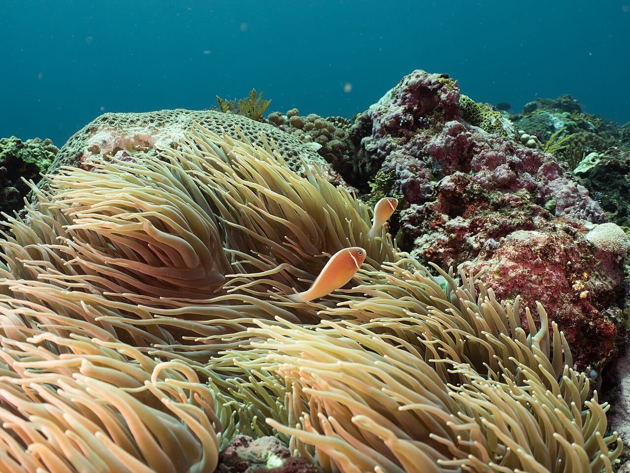 Clownfish live among anemone tentacles, gaining protection from predators. In return, they provide the anemone with nutrients through waste and help keep it clean.