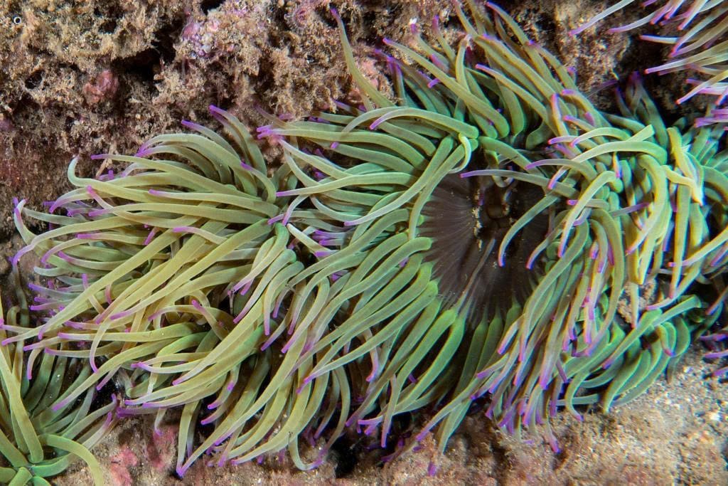 Snakelocks Anemones are easily recognizable due to their long, green, snake-like tentacles tipped with purple hues. They inhabit shallow subtidal zones and attach firmly to rocks. Symbiotic algae provide energy through photosynthesis, supplementing their predatory diet.