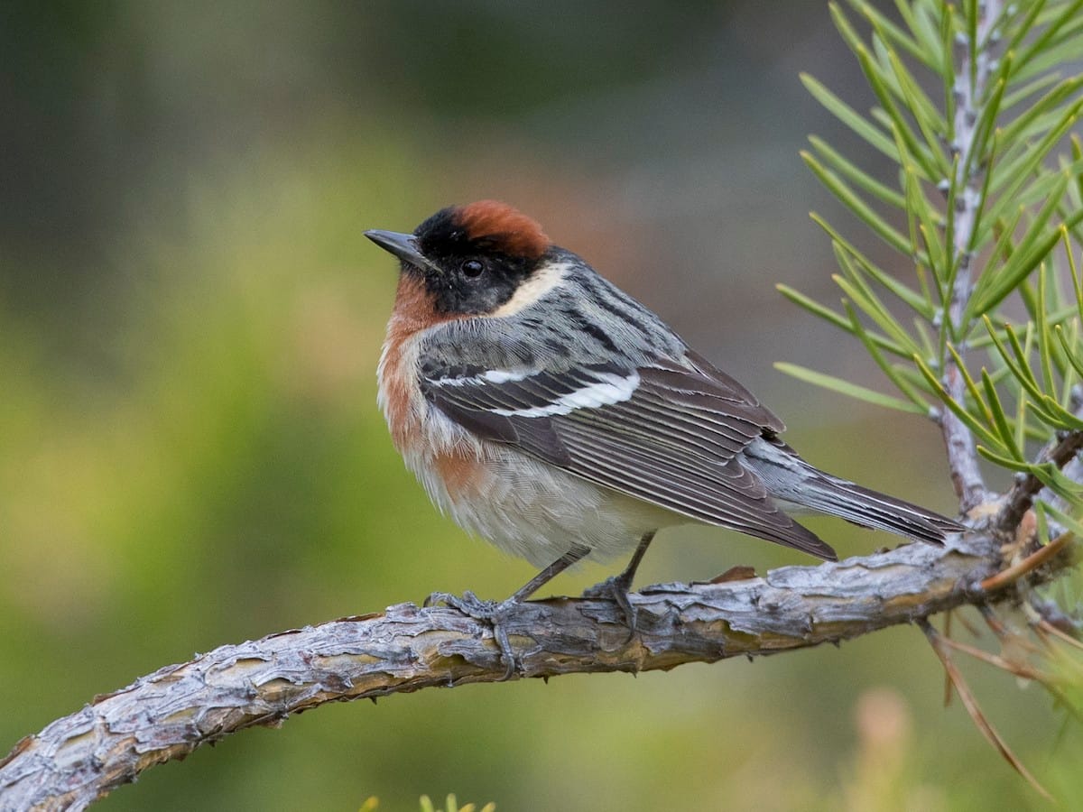 Bay-breasted Warbler has chestnut-colored sides, gray back, and black throat, migrating long distances between Canada and South America.