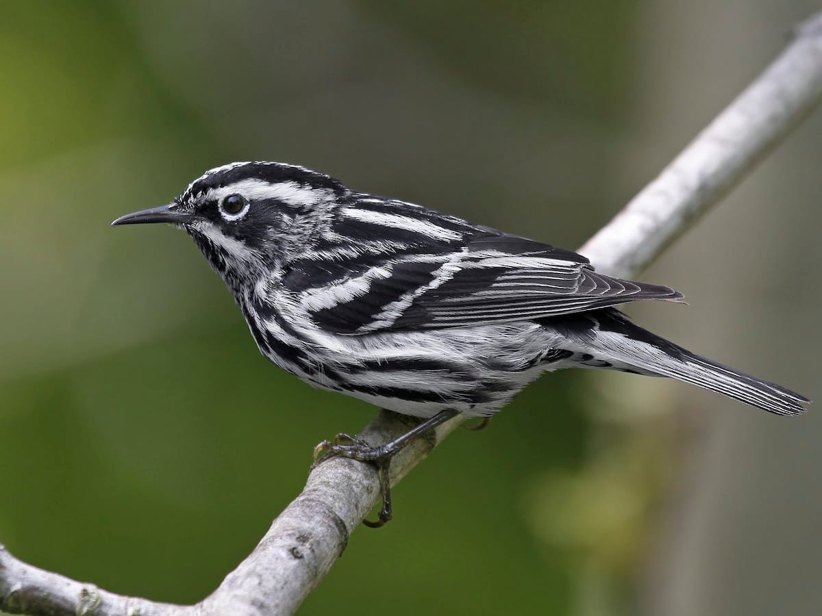 The Blackpoll Warbler is famous for its extraordinary migratory journey, traveling thousands of miles from northern North America to northern South America over the Atlantic Ocean. Breeding males display striking black and white plumage with bold streaks, while females and juveniles are paler with olive-gray tones.