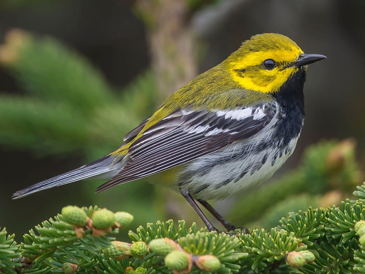 Townsend’s Warbler is a medium-sized warbler with a striking combination of black, yellow, and green plumage. Males display vivid black facial markings with bright yellow underparts, while females and juveniles are more muted with olive tones. They inhabit coniferous forests along the western coast of North America and migrate to Mexico during winter.