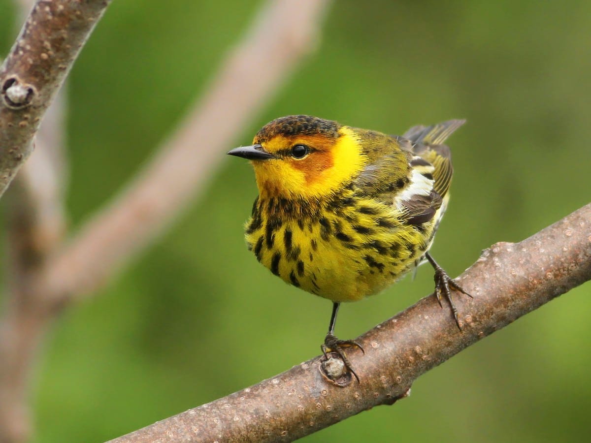 The Cape May Warbler is a strikingly patterned warbler known for its yellow underparts streaked with black and olive-brown upperparts. Males display a bright orange patch on the throat, while females are more muted but still feature bold streaking. Breeding occurs in spruce-fir forests in Canada and the northeastern United States, while wintering populations migrate to the Caribbean and Central America.