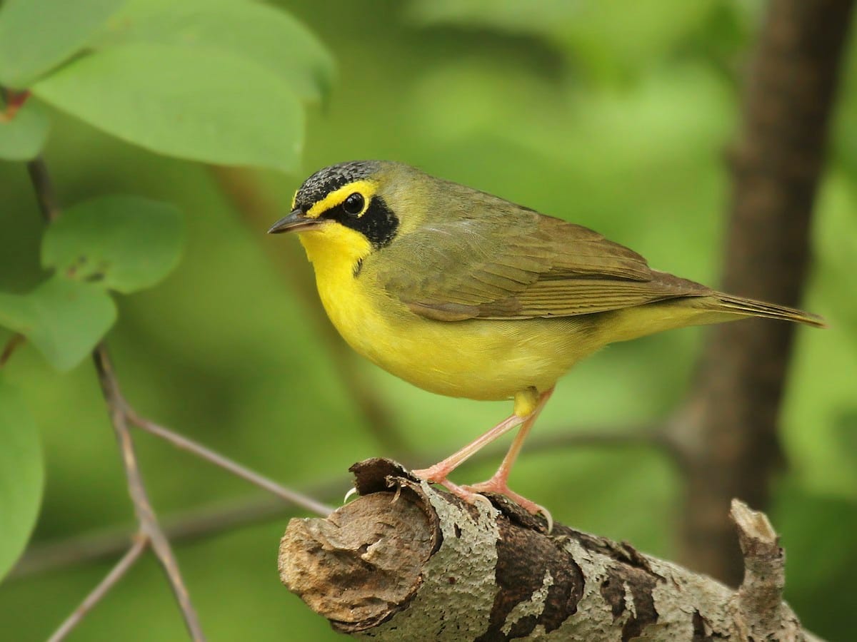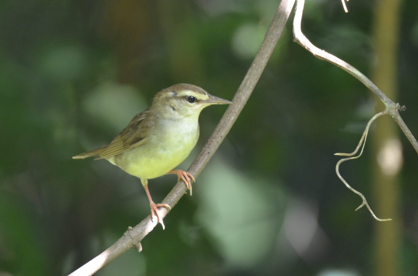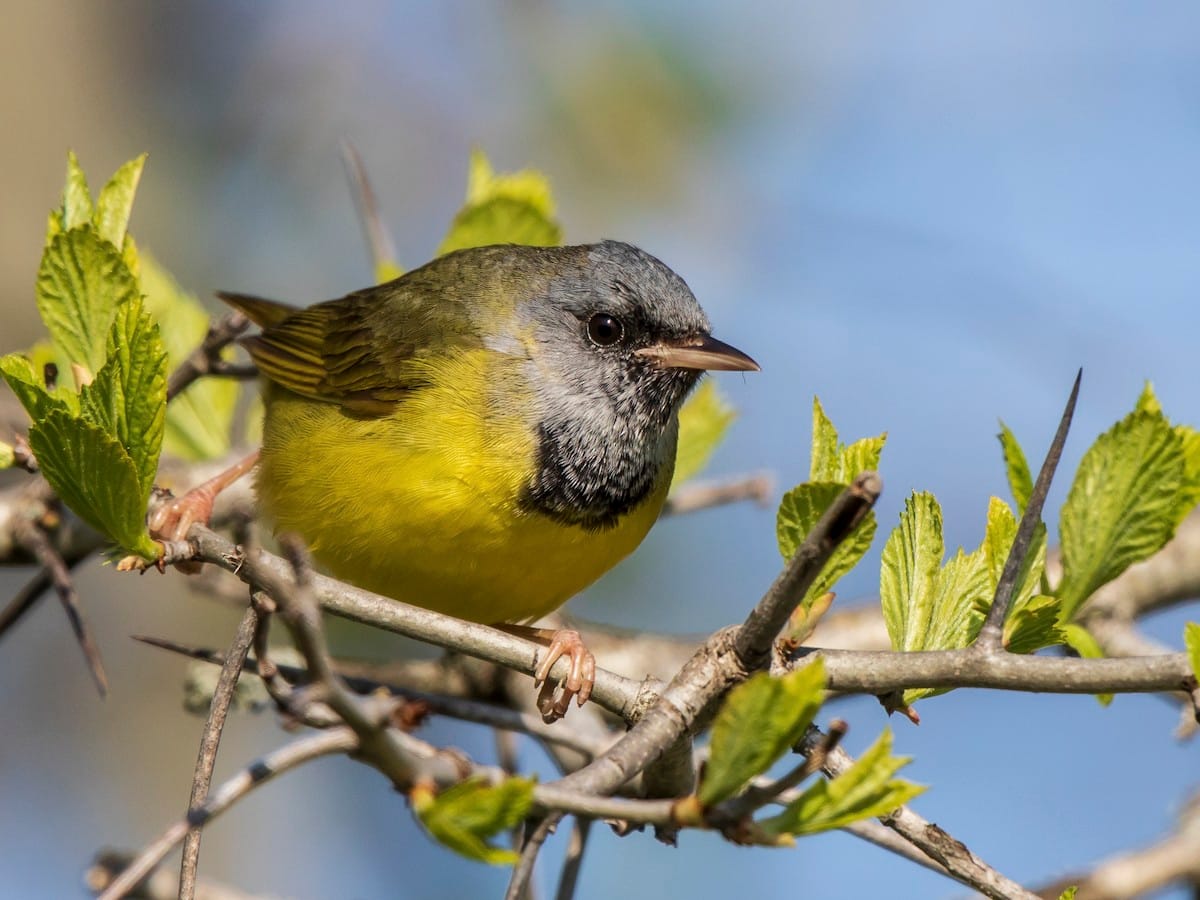 Mourning Warbler is a shy forest species with olive-green upperparts, yellow underparts, and a subtle black hood on males.