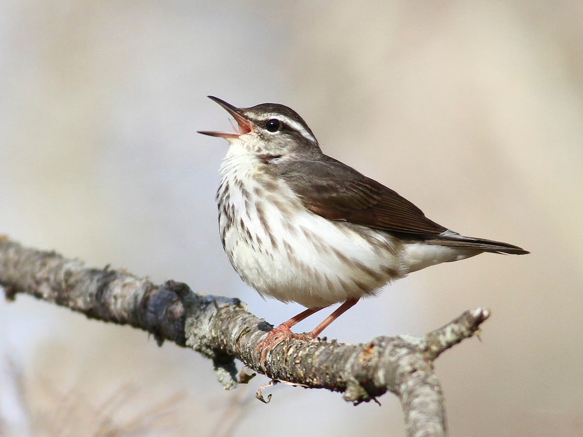 Northern Waterthrush has bold streaks and forages along streams and wet forest floors, while Louisiana Waterthrush prefers fast-flowing streams and has more prominent streaking and distinctive song patterns.