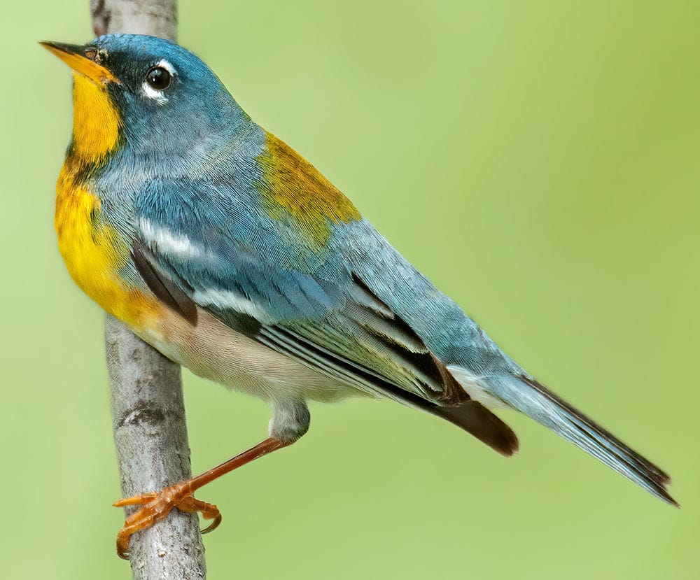 The Northern Parula is a tiny, brightly colored warbler with blue-gray upperparts, yellow throat and chest, and a distinctive greenish back patch. They breed in mature forests with ample epiphytic moss and lichen, often using hanging moss or old bird nests to build their own.
