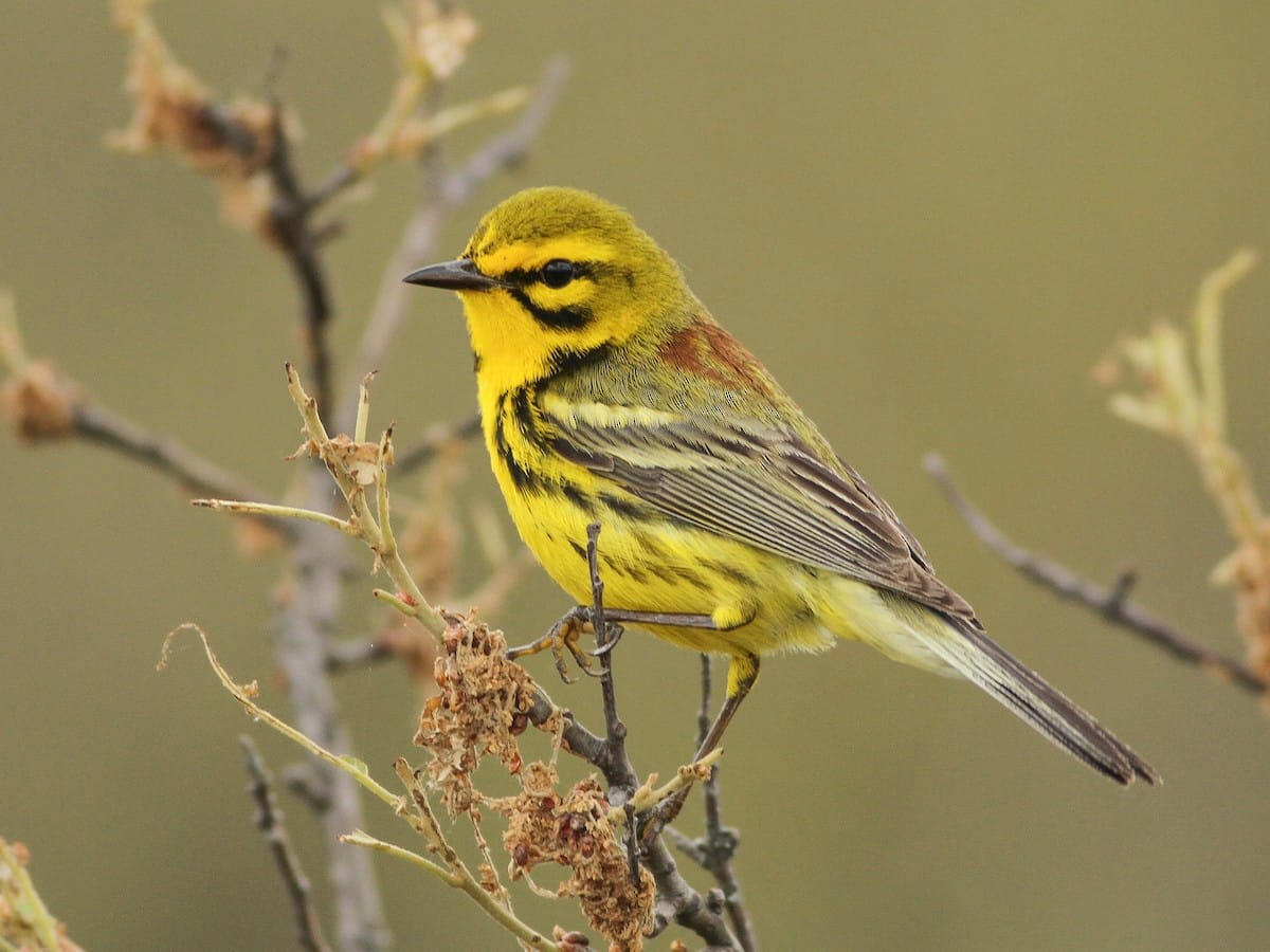The Prairie Warbler is a small, brightly colored warbler with yellow underparts, grayish olive back, and dark streaks along the sides. Males have distinctive black streaks along the chest and sides, which intensify during breeding season. They are commonly found in shrubby fields, open woodlands, and edge habitats in the eastern United States.